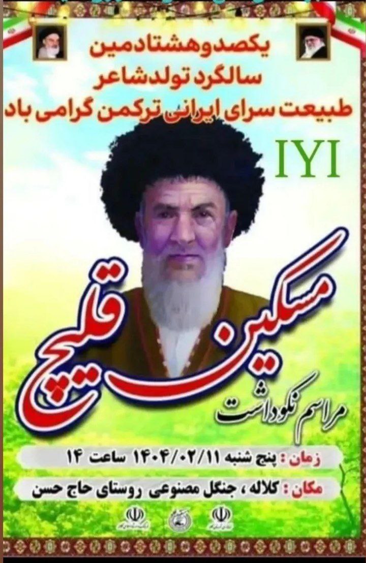 پایگاه خبری اولکامیز – به مناسبت ۱۸۰ مین سالگرد مسکین قلیچ تولد شاعر طبیعت‌سُرای ایرانی ترکمن، مراسم نکوداشت ایشان، در روز پنج‌شنبه ۱۱ اردیبهشت ۱۴۰۴ در سالن ارشاد شهر کلاله برگزار می‌گردد. امانقلیچ شادمهر نویسنده ترکمن و رئیس انجمن ادبی جیحون در این باره نوشت: