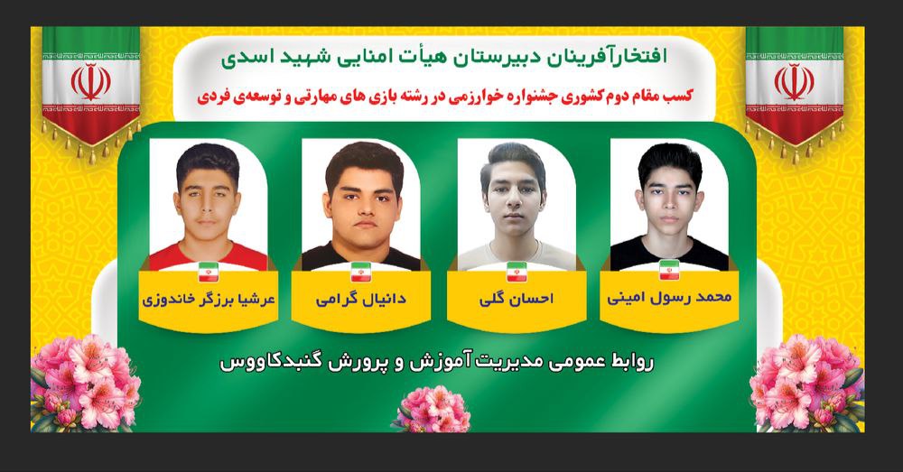 کسب مقام دوم کشوری در جشنواره ملی خوارزمی توسط دانش‌آموزان توانمند دبیرستان هیأت امنایی شهید اسدی، افتخاری بزرگ و مایه مباهات جامعه فرهنگی شهرستان است.