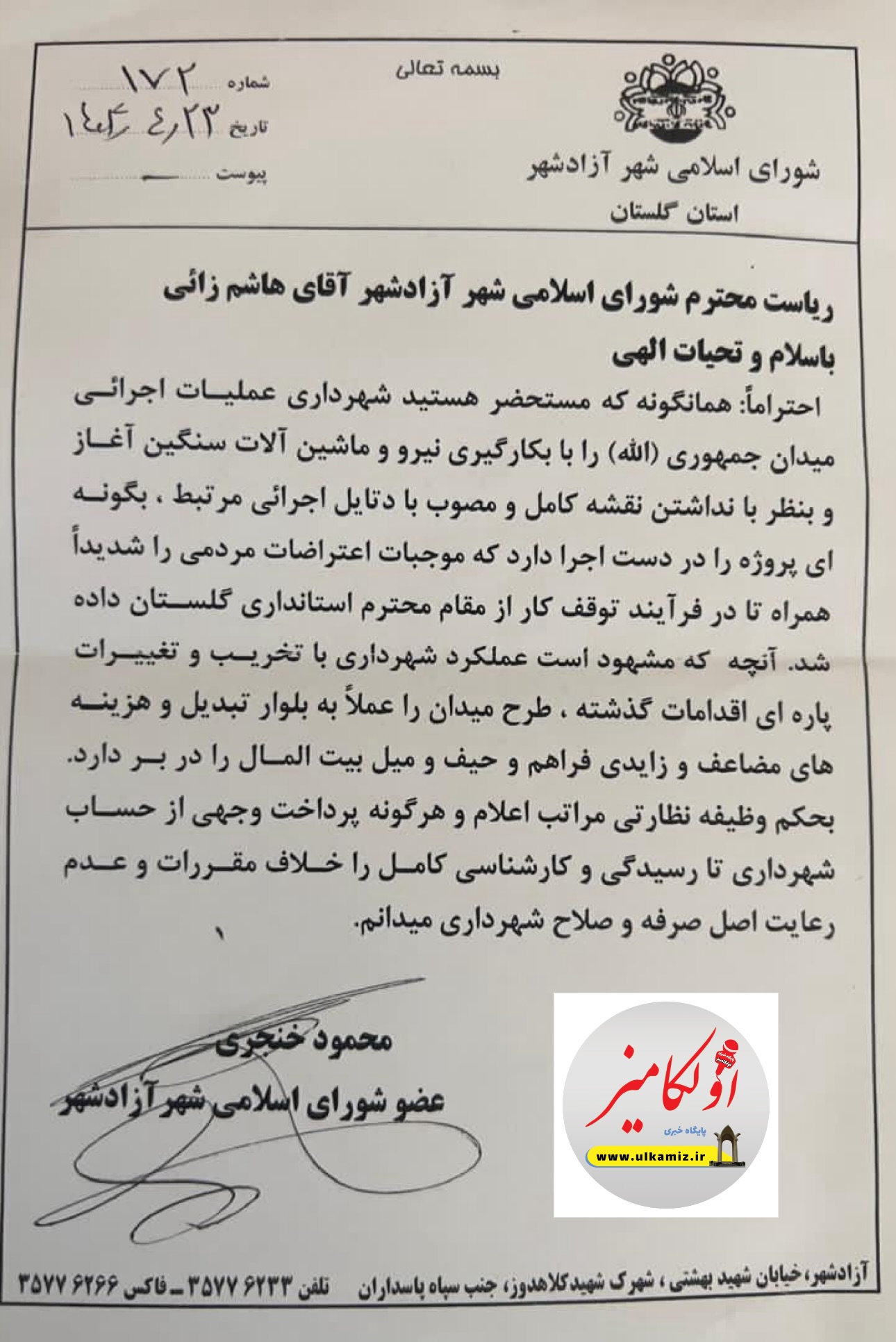 پایگاه خبری اولکامیز – درنه صفائی برج، خبرنگار؛نامهای از سوی عضو شورای شهر آزادشهر منتشر شده که به توقف عملیات اجرایی میدان جمهوری اسلامی به دلیل نداشتن نقشه کامل و مصوب اشاره دارد و از اعتراضات شدید مردمی خبر میدهد.